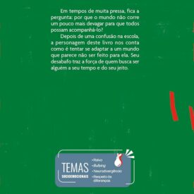 Em tempos de muita pressa, fica a pergunta: por que o mundo não corre um pouco mais devagar para que todos possam acompanhá-lo? Depois de uma confusão na escola, a personagem deste livro nos conta como é tentar se adaptar a um mundo que parece não ser feito para ela. Seu desabafo traz a força de quem busca ser alguém a seu tempo e do seu jeito.