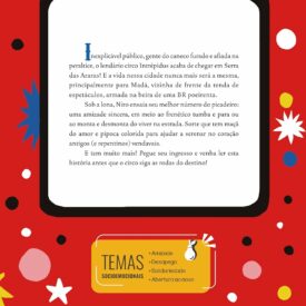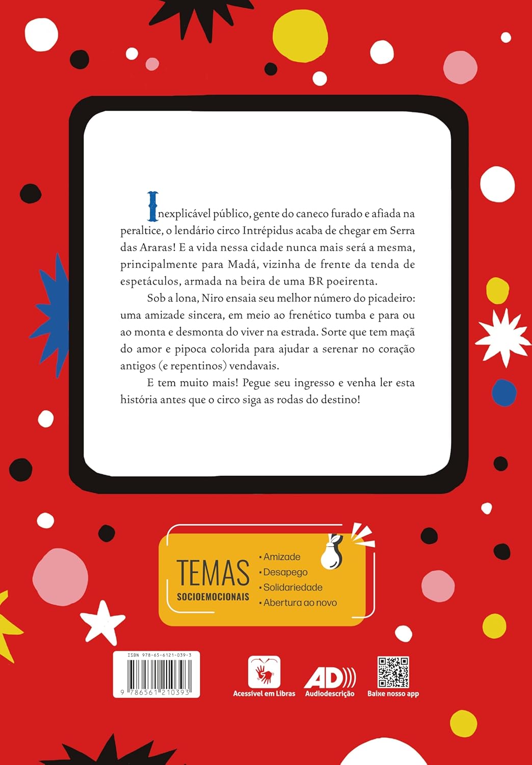 Inexplicável público, gente do caneco furado e afiada na peraltice, o lendário circo Intrépidos acaba de chegar à Serra das Araras! E a vida nessa cidade nunca mais será a mesma, principalmente para Madá, vizinha de frente da tenda de espetáculos armada na beira de uma BR poeirenta. Sob a lona, Niro ensaia seu melhor número do picadeiro: uma amizade sincera, em meio ao frenético tumba e para ou ao monta e desmonta do viver na estrada. Sorte que tem maçã do amor e pipoca colorida para ajudar a serenar no coração antigos (e repentinos) vendavais. E tem muito mais! Pegue seu ingresso e venha ler esta história antes que o circo siga as rodas do destino!